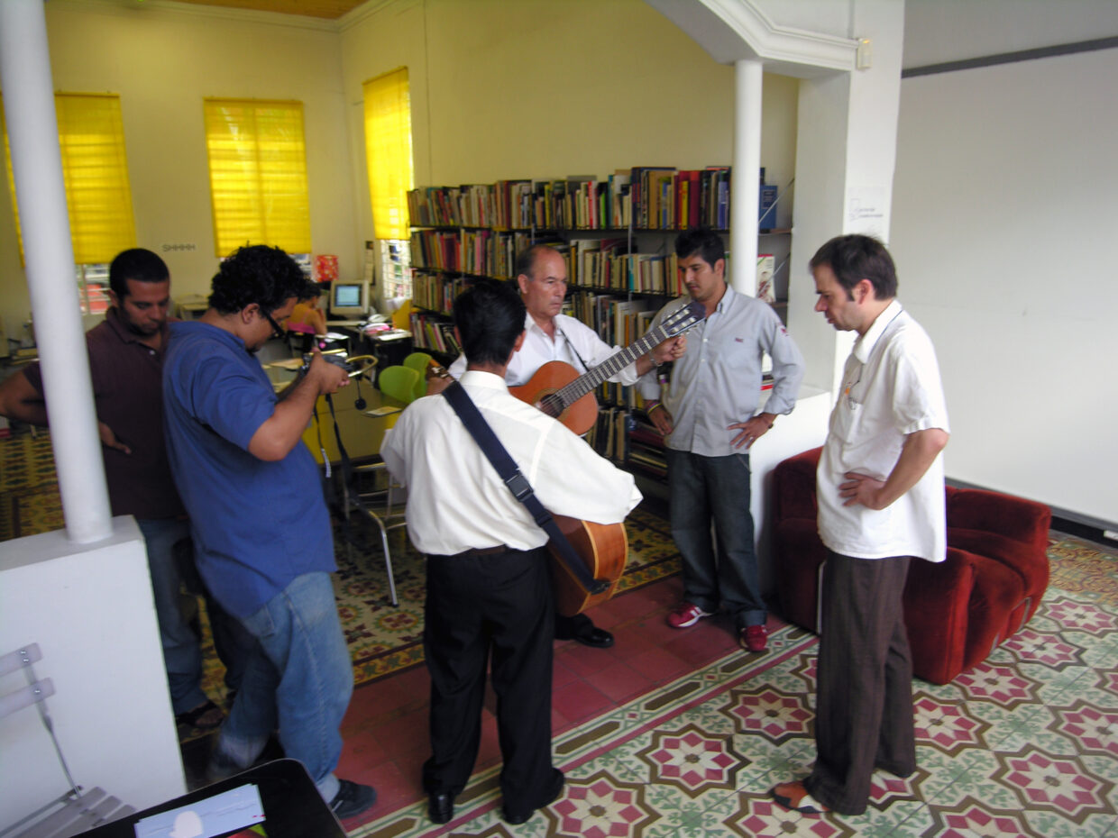 Ich hatte die Band Los Expresidentes in die Galerie geladen. Kurz vor Eintreffen der Besucher*innen begann ich den Musikern die deutsche Nationalhymne vorzusingen und bat sie die Hymne nachzuspielen. Das Prozedere von Vorsingen und Nachspielen wurde nach ca. 40 Minuten abgebrochen. Zu diesem Zeitpunkt war das Gros der Besucher eingetroffen und gleichzeitig ein Musikstück im Ansatz erkennbar. Die Probe wurde durch ein zweisprachiges (spanisch / deutsch) Plakat im Stadtraum angekündigt.